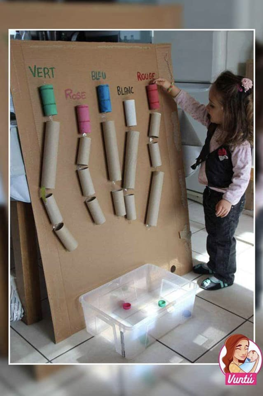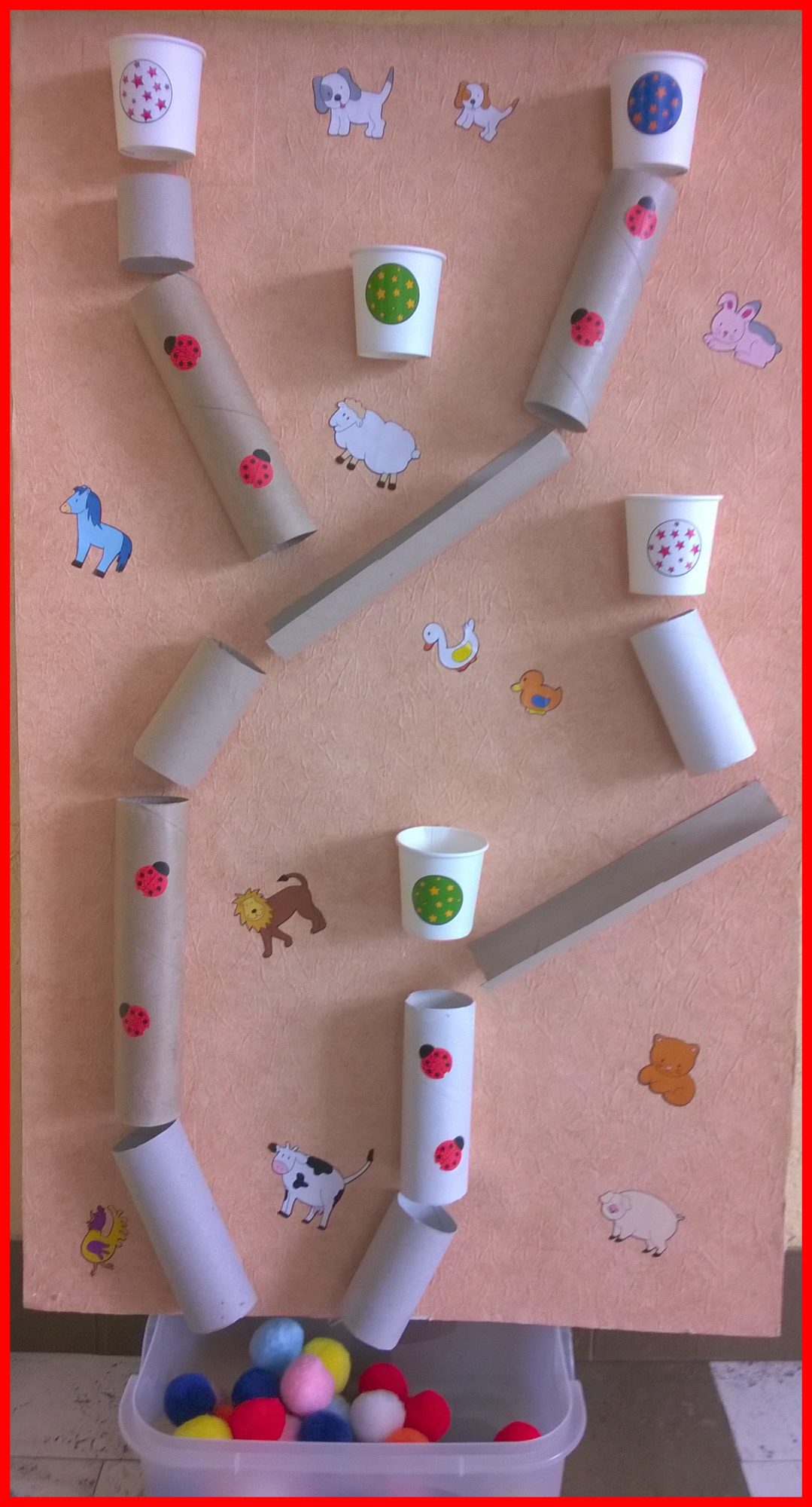 La seule chose qu’il vous faudra peut-être acheter, c’est une planche. Cependant vous pouvez l’improviser avec autre chose, comme une partie d’un grand carton. Une fois que vous avez votre planche, collez des rouleaux de papier toilette et papier ménage, et aussi des gobelets en carton sans le fond, ou même des bouteilles en plastique sans le fond ; un peu partout, afin de construire un tunnel. Ensuite placez un bac par terre et proposez à l’enfant de jouer avec ! Il fera rouler les balles dans les différents tunnels 🙂 Il peut participer en coloriant les rouleaux ou le carton par exemple ! 🙂