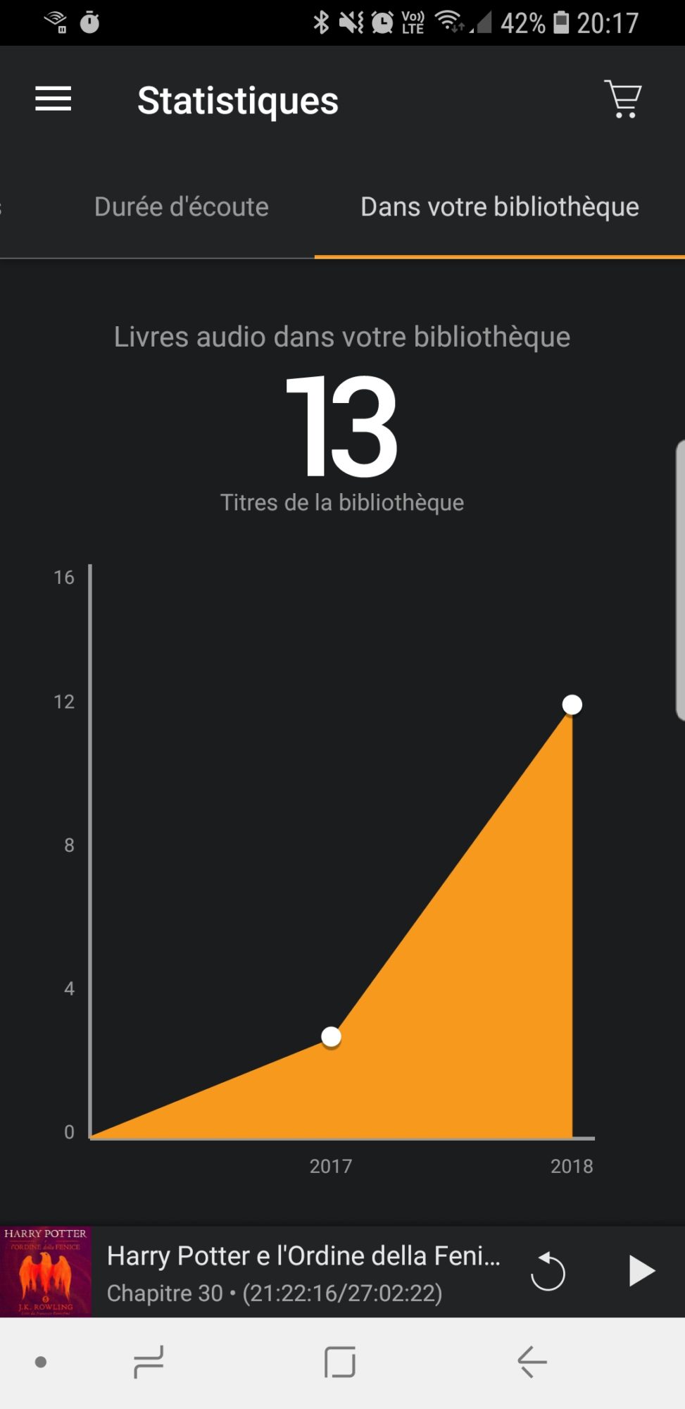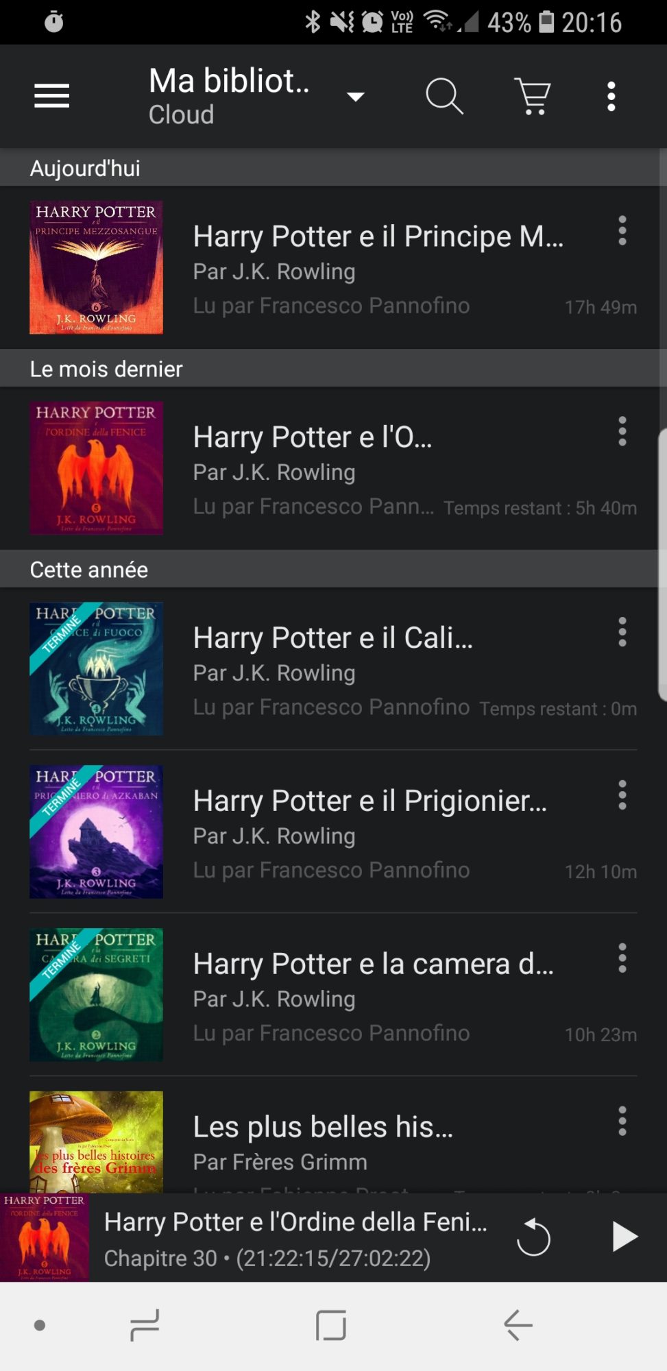 C’est une chose toute simple en fait, mais franchement c’est un concept que je trouve juste génial ! Et je parle donc d’Audible 🙂 Il s’agit d’une application que vous pouvez installer sur votre téléphone, tablette ou même juste utiliser depuis le site web audible.fr, et qui vous permet d’écouter des livres ! Ça se passe via un abonnement mensuel où vous payez 9.99€ tous les mois et vous recevez 1 crédit. Avec ce crédit vous pouvez acheter le livre audio de votre choix parmi ce qui est proposé sur leur site, ça peut être un livre à 9€ ou à 40€. De mon côté je suis en train d’écouter tous les Harry Potter, en ce moment il me reste 8 chapitres pour terminer Harry Potter 5 !