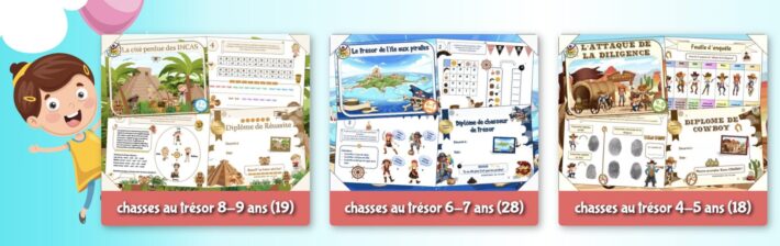 - Un jeu de chasse au trésor avec tout le matériel déjà prêt où il ne vous reste plus qu’à imprimer les énigmes et à les cacher !