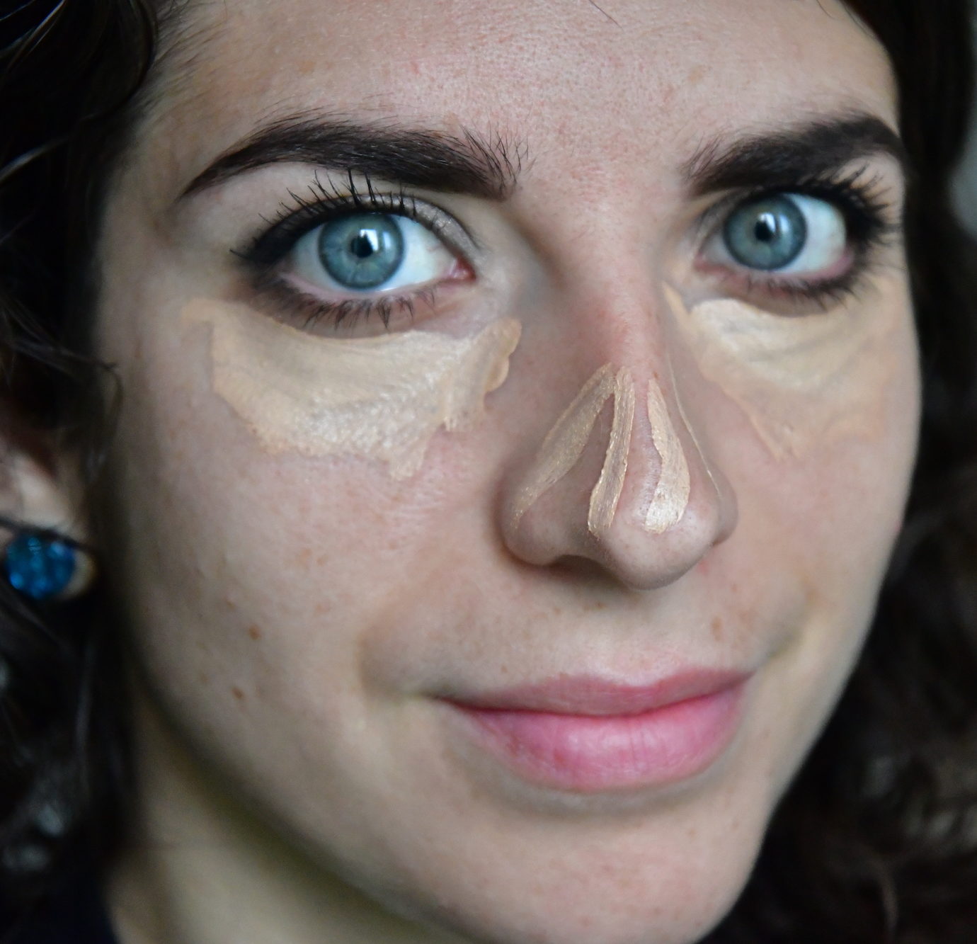 Personnellement j’applique en général un correcteur orangé en coin interne avant, pour cacher les veines bleues qui se voient de partout dans cette zone. Puis j’applique l’anticernes. J’ai ainsi un peu plus de couvrance, mais si je ne le fais pas, je dois passer au moins 2 fois avec l’anticernes.