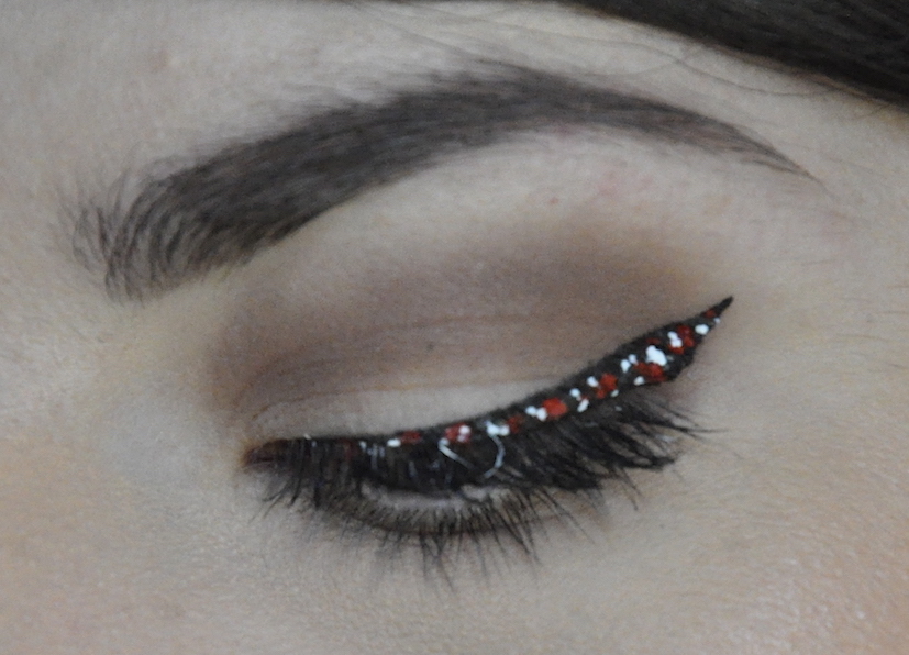 Pour la partie « dot liner », j’ai commencé par faire mon trait noir tout simple avec le Graphik Ink Liner de Clarins (que j’ai gagné à un concours). J’ai ensuite pris le pinceau 315 Fine Liner de Zoeva pour réaliser les points rouges avec le Melted Matte en teinte Lady Balls de Too Faced (ma revue ici), puis j’ai pris le White Liquid Liner de Nyx pour faire les points blancs. J’ai terminé le maquillage des yeux en appliquant le mascara Excessive Lash de Make Up For Ever (ma revue ici).