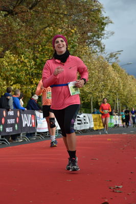 Une centaine de mètres avant l’arrivée et je ne voyais toujours pas ma famille et mon chéri, j’étais presque un peu déçue, mais bon, je continuais à espérer qu’ils soient là comme ils avaient dit. Et là, les 10 derniers mètres, on arrive sur le tapis rouge de l’arrivée et je vois mes parents et ma soeur qui m’encouragent plus que tout ! Je suis tellement soulagée de les voir ! Je leur fait un énorme sourire et je lève les bras au ciel en signe de victoire et j’accélère à 5:48 jusqu’à l’arrivée ! J’ai envie de pleurer tellement je suis émue. Ça y est, c’est fini, je l’ai fait !! 😀