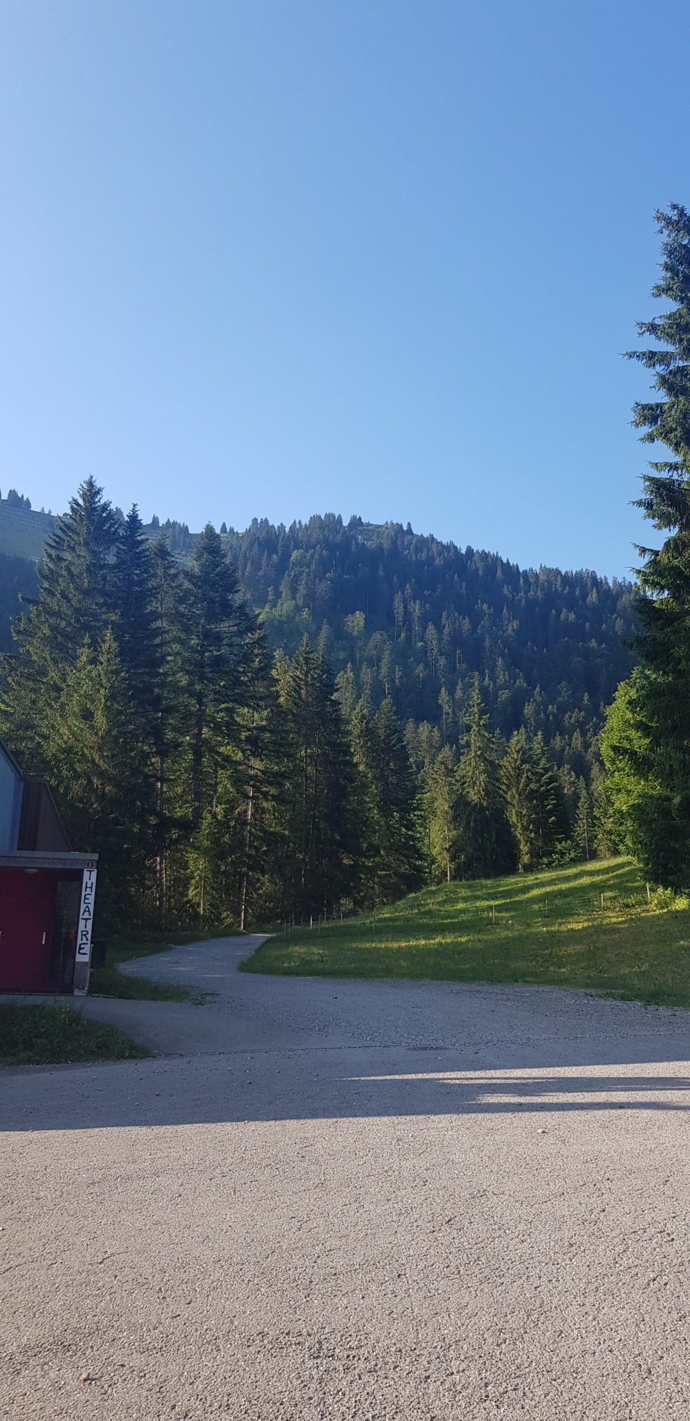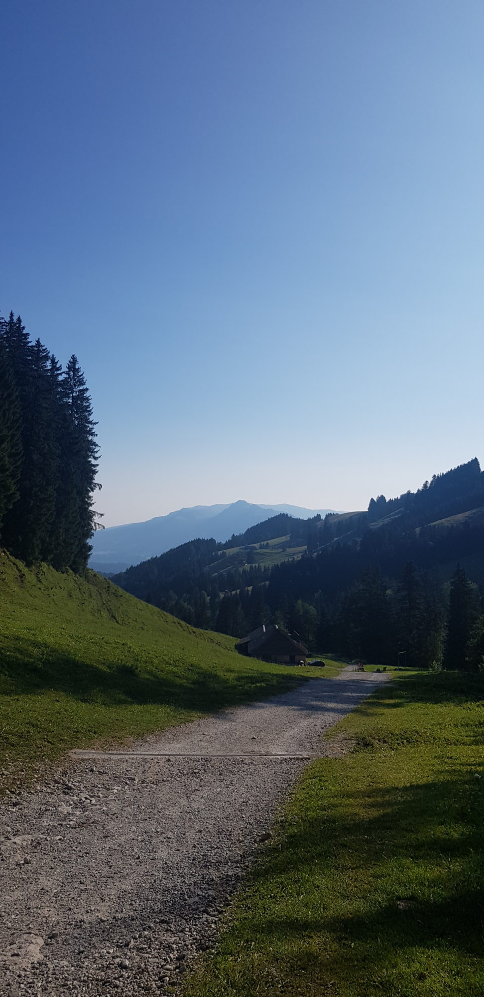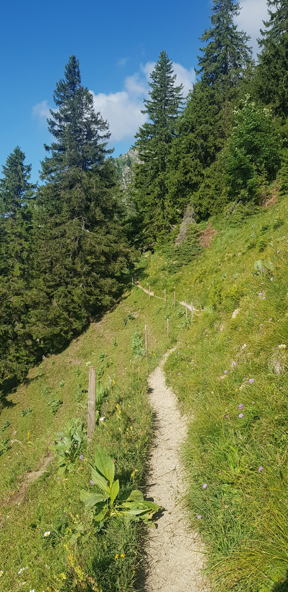 Départ à 8h15, nous avons choisi le chemin le plus court (indiqué 2h50) pour arriver au Moléson. Ça commence fort, le chemin est très raide pendant au moins une heure ! Nous arrivons à une bifurcation, celle de droite mène au départ du téléphérique, mais nous décidons d’aller à gauche. Nous arrivons devant un chalet et nous continuons à suivre le panneau qui indique « Le Moléson », comme depuis le début.