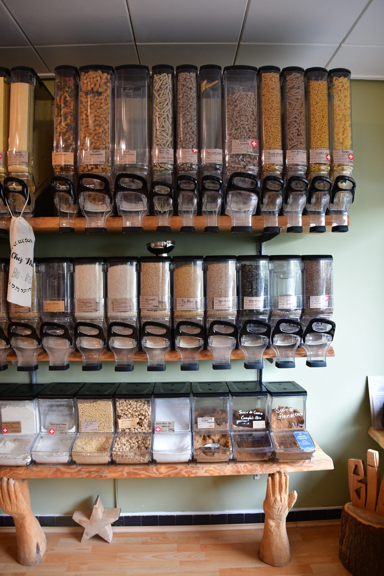 Je crois que si vous cherchez quelque chose en vrac, c’est Chez Mamie que vous pourrez le retrouver ! Il y a de TOUT ! Différentes sortes de pâtes, de riz, de café, de céréales, de farine et de sucre, des graines de courge, de tournesol, de lin, de la semoule, des protéines de soja, des flocons d’avoine… la liste est longue et variée, c’est super !