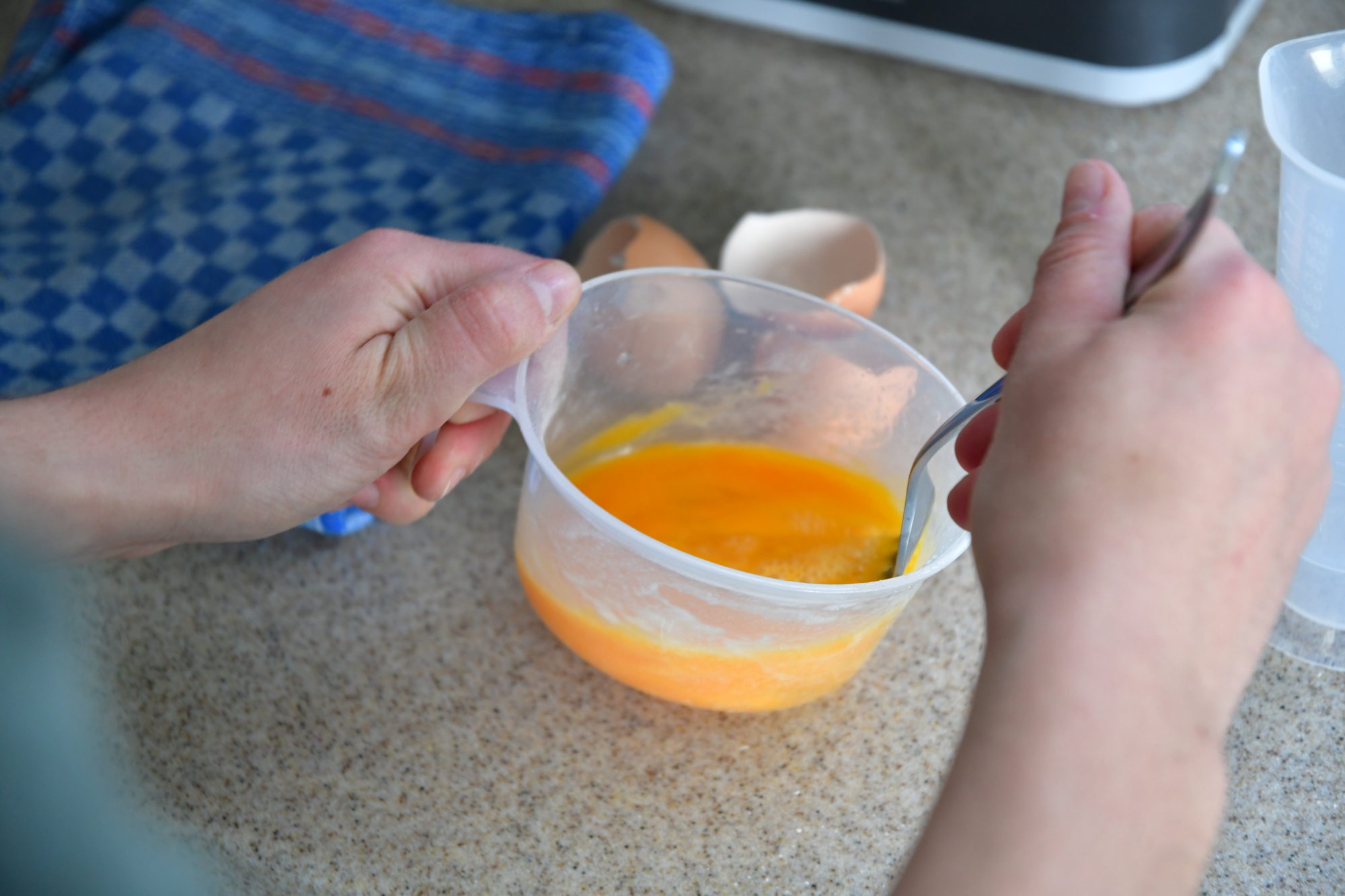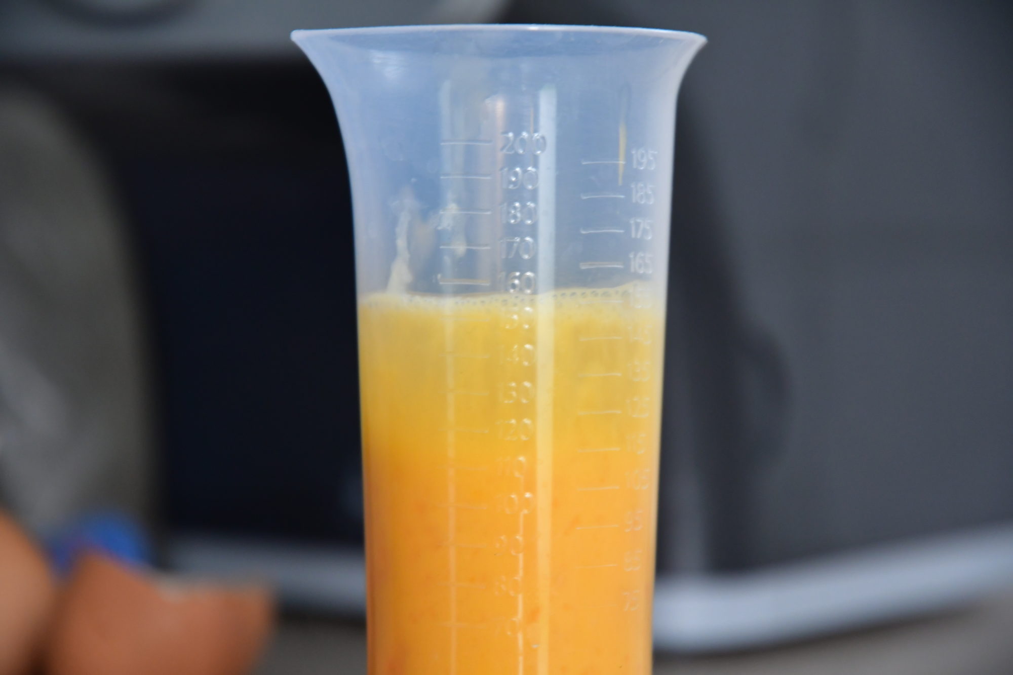 Et là si vous avez sélectionné le mode « eau », vous versez de l’eau uniquement. Si vous avez sélectionné le mode « oeuf », vous cassez l’oeuf dans la tasse de la farine, vous le fouettez, vous rajoutez l’eau et vous mélangez à nouveau. Il est important que tout soit bien mélangé, sinon le mélange ne sera pas homogène avec la farine. Personnellement ici nous avons mis 2 oeufs et environ 30ml d’eau. On aurait pu mettre un seul oeuf et plus d’eau, ça aurait joué aussi.