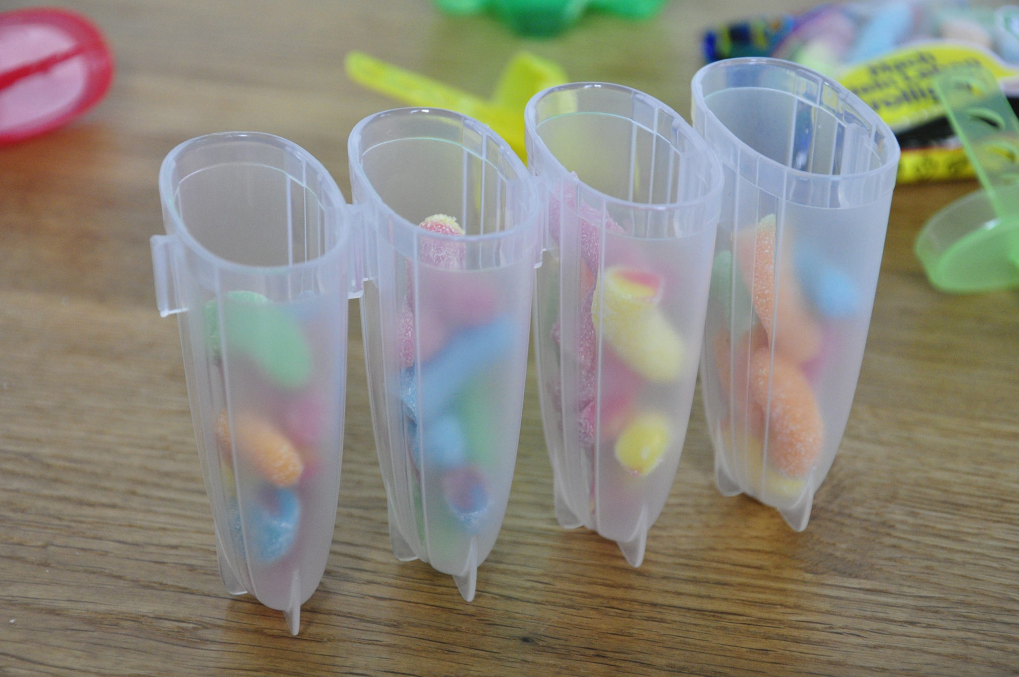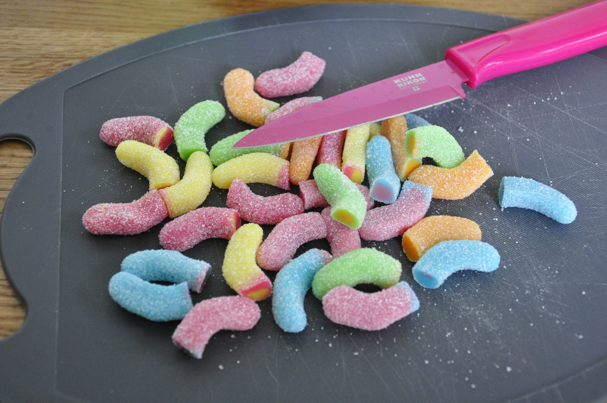 - Coupez les bonbons en 4 (je les ai coupés en 2, mais je me rends compte que les couper en 4 c’est mieux). Ne pas en mettre trop (conseil d’une amatrice de bonbons 😉 )