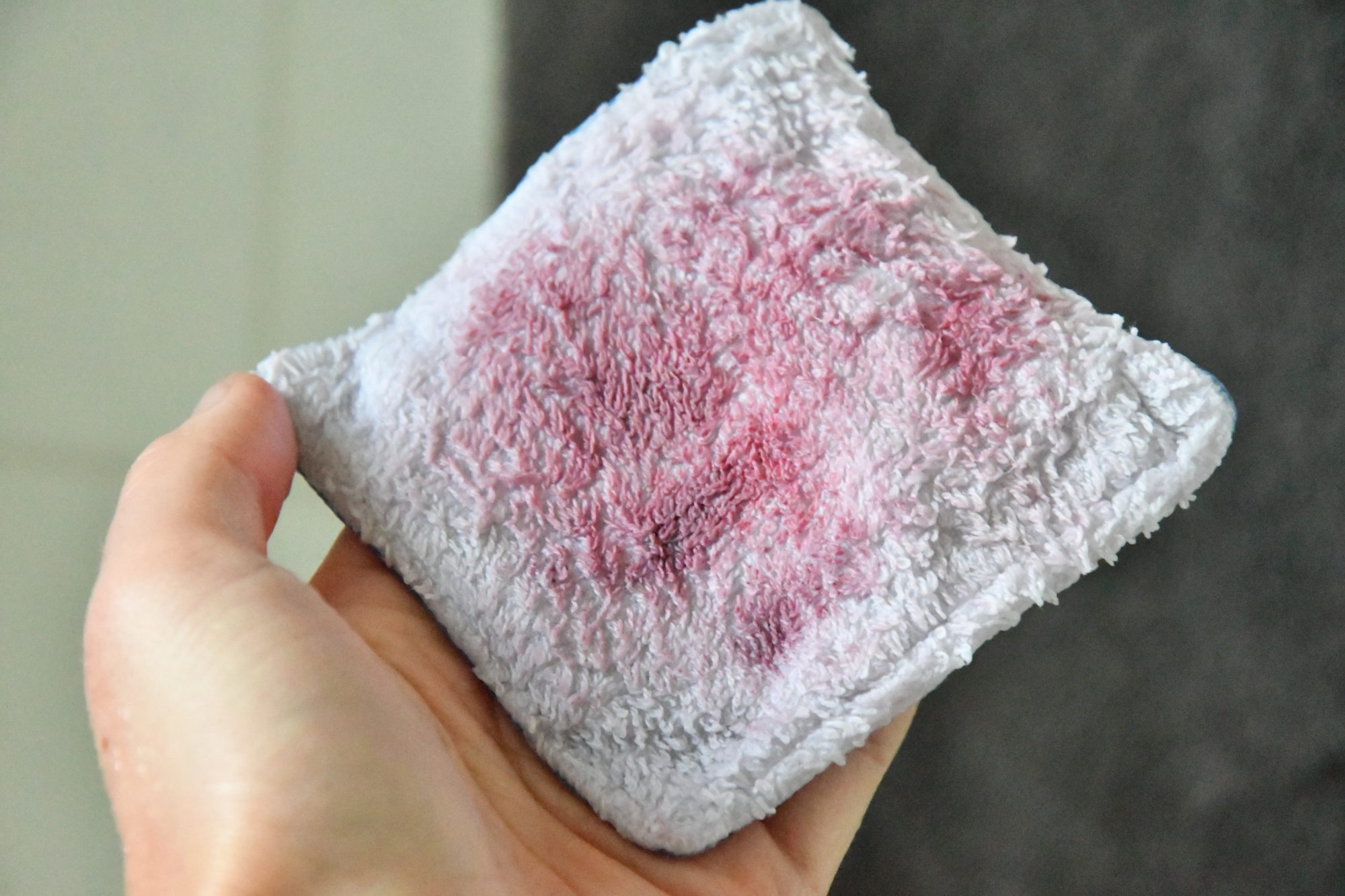 Et le démaquillant ne se rince pas à l’eau directement. Enfin, vous pouvez, mais premièrement ça laissera un peu des traces de gras dans le lavabo et deuxièmement ça vous laissera à vous aussi une fine couche un peu grasse sur la peau. En fait ce que je fais, c’est que je prends un coton lavable (ou vous pouvez prendre un coton jetable aussi), je le passe sous l’eau et je me rince le visage avec. Généralement j’en utilise deux : un pour bien passer partout et enlever la première couche de maquillage/démaquillant ; et l’autre pour finir le démaquillage, pour m’assurer que tout est bien parti. Et voilà, c’est fait ! 🙂