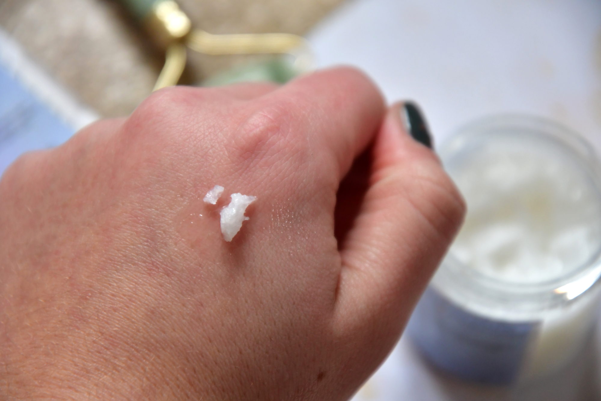 Je l’appelle baume car la texture est un peu difficile à définir. Ça a la même texture que de l’huile de coco solidifié disons, plus ou moins 🙂 D’ailleurs si je regarde les ingrédients, il est en première position : huile de coco bio, parfum naturel de fleur d’oranger, parfum naturel de monoï, mica brillant.