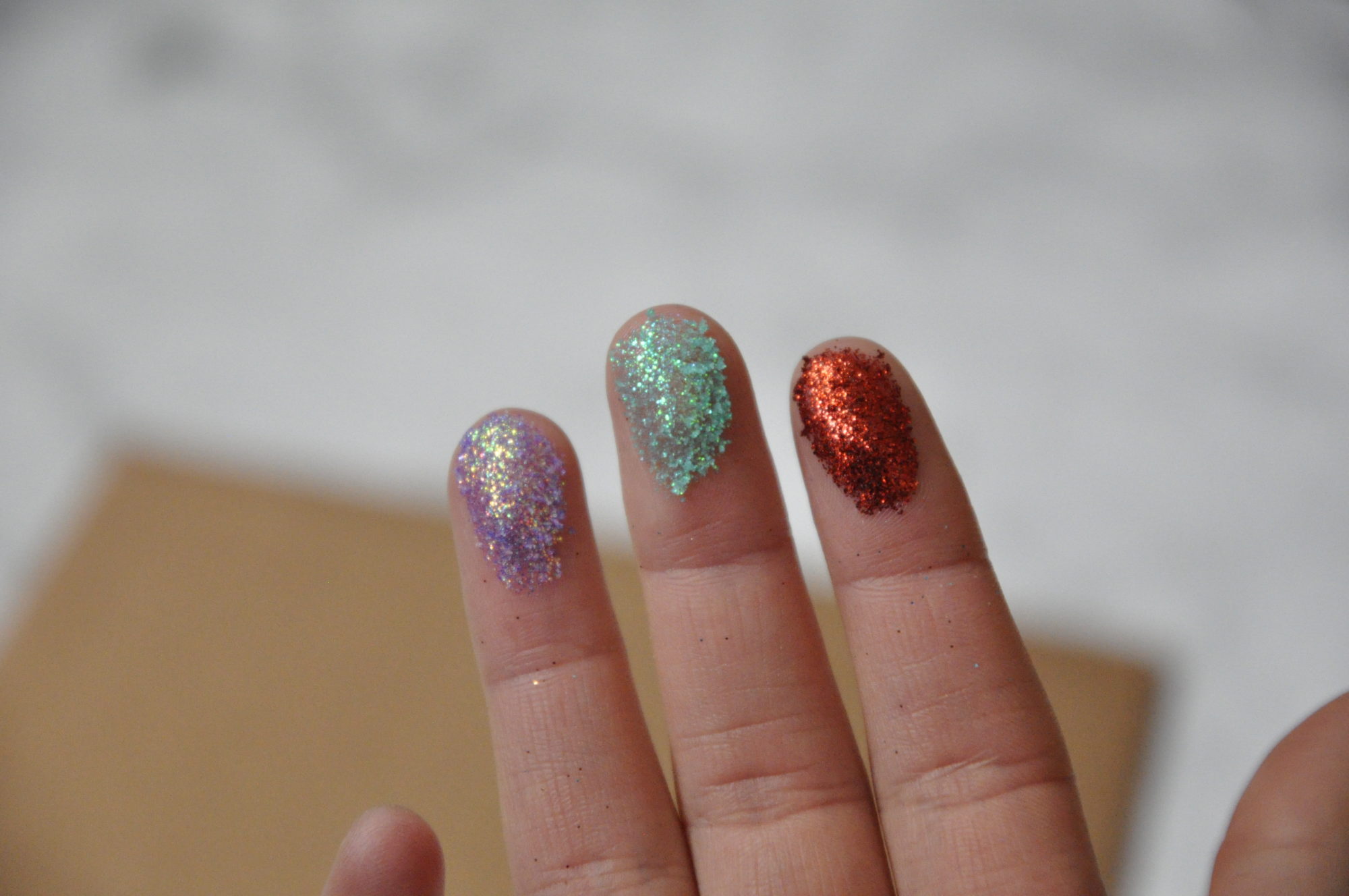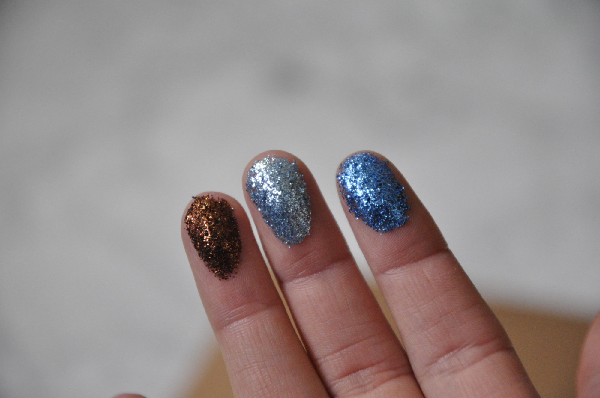 Difficile de faire des swatches ! J’avais commencé, mais j’ai vite abandonné, car on se met vraiment des paillettes PARTOUT. Mais je peux vous garantir que le rendu est exactement comme on voit les paillettes telles quelles en photo 🙂