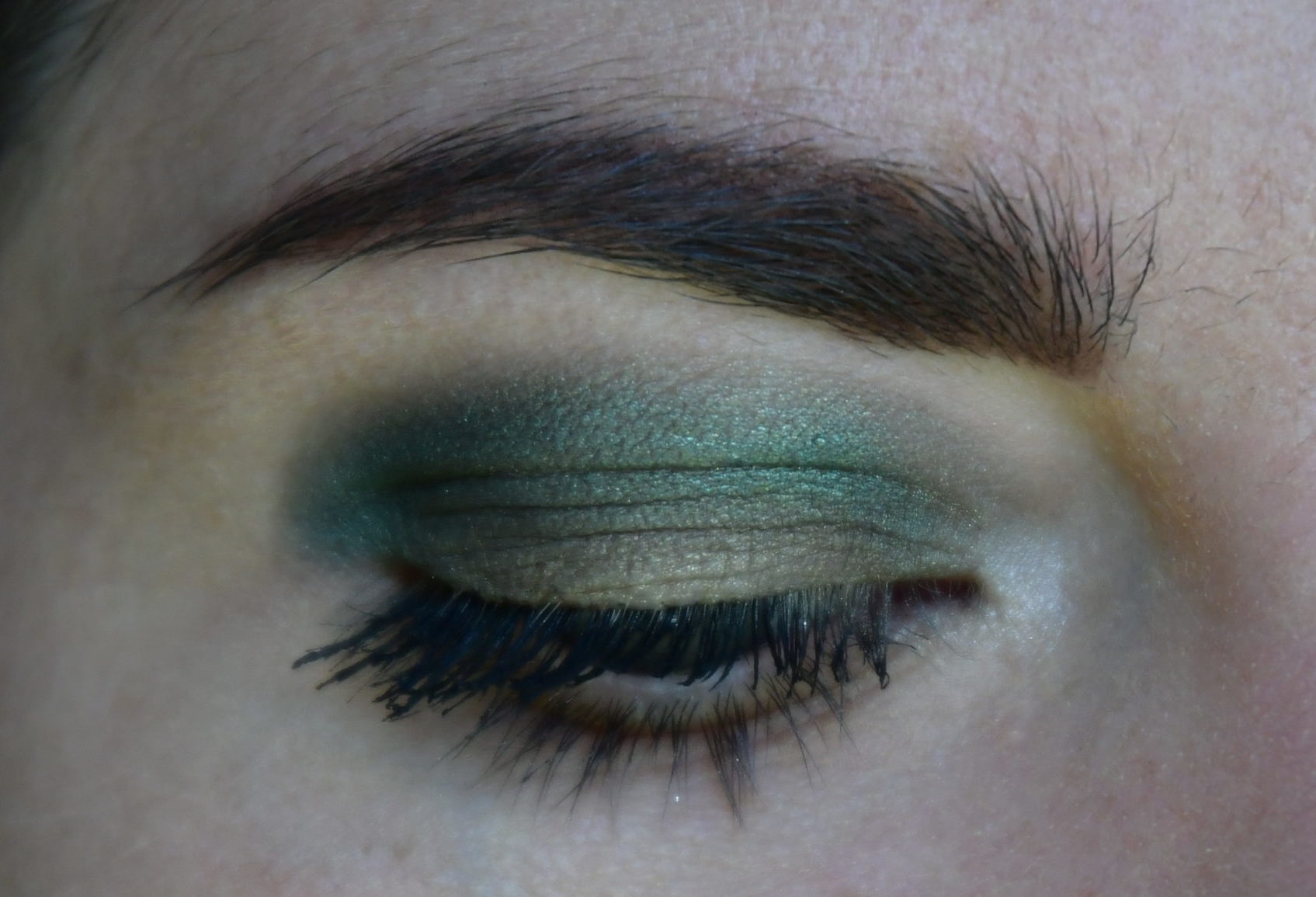 1. J’ai d’abord appliqué le fard vert foncé dans le creux de paupière