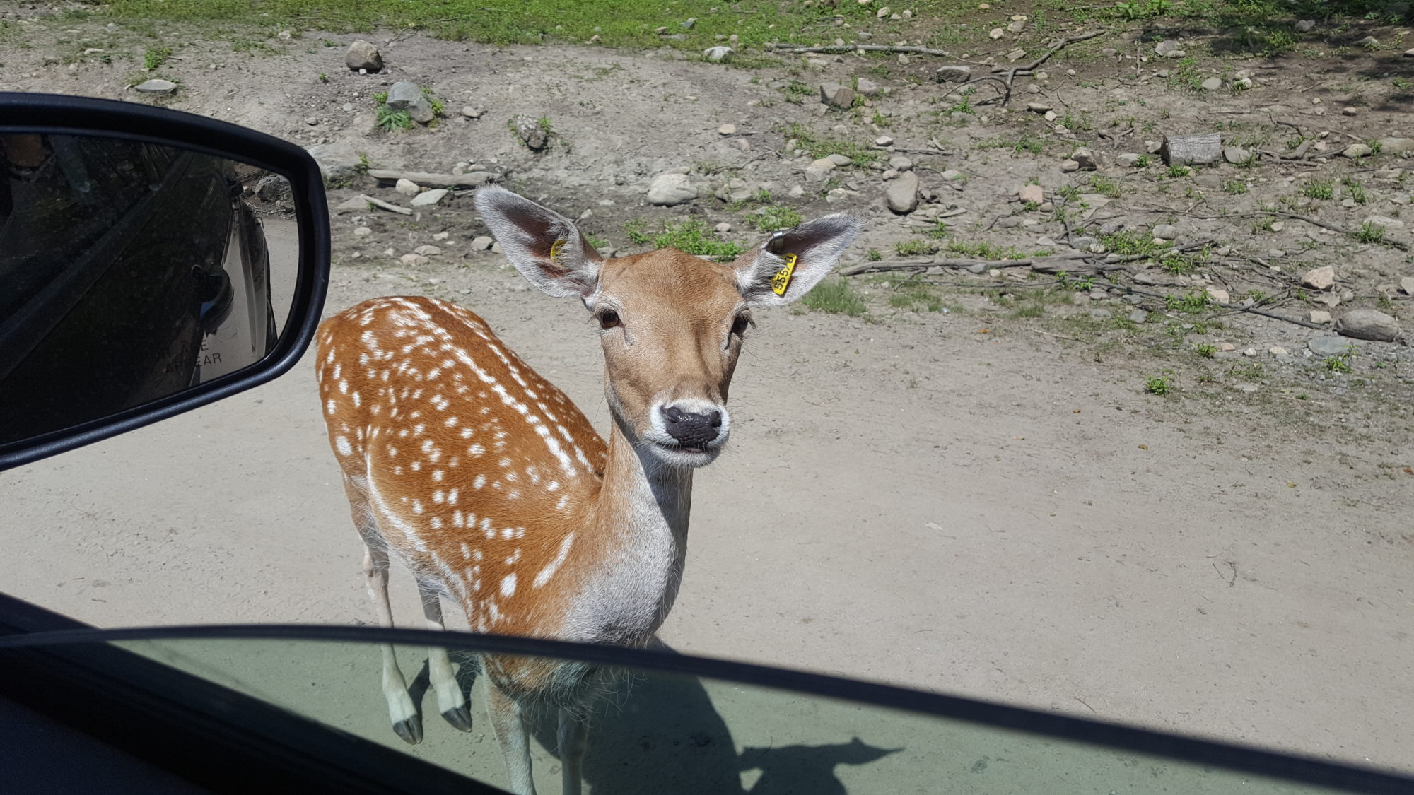 Exemples : « ne pas s’arrêter sur le grillage pour nourrir les animaux », « ne pas nourrir les loups », « durant le parcours en voiture, laissez vos vitres levées à moitié pour ne pas laisser la tête des animaux entrer dans votre véhicule ». Nous avons vu toutes ces situations, surtout une fille qui avait baissé toutes les fenêtres de la voiture et criait parce que deux cerfs (sans les bois) avaient la tête entière dans sa voiture et étaient à 2cm d’elle. Ou encore une famille qui passait devant l’enclos des loups, et le père lançait des restes de carottes, alors qu’il y avait clairement le panneau qui indiquait qu’il ne fallait pas nourrir les loups. Bref, vous avez compris 🙂