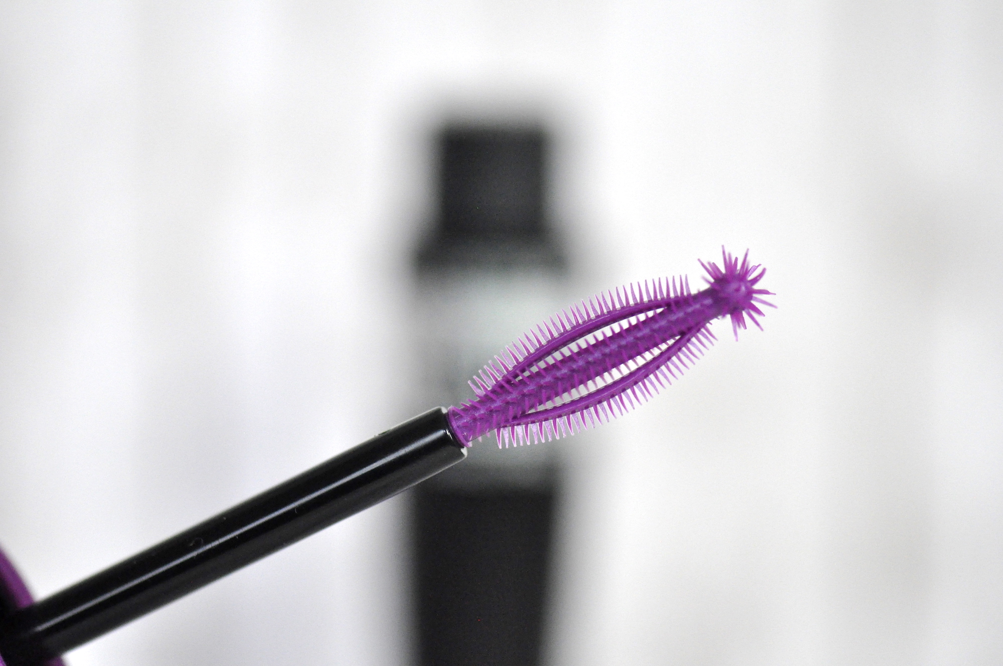 J’aime bien ce packaging noir et violet, et la forme du mascara est assez commune à celle d’autres marques. Voilà, rien de foufou. Au début le mascara ne se présente pas comme les autres, en effet le produit est fermé par un bouchon et on peut bien voir la brosse sans produit noir. Et donc oui, la brosse est originale !