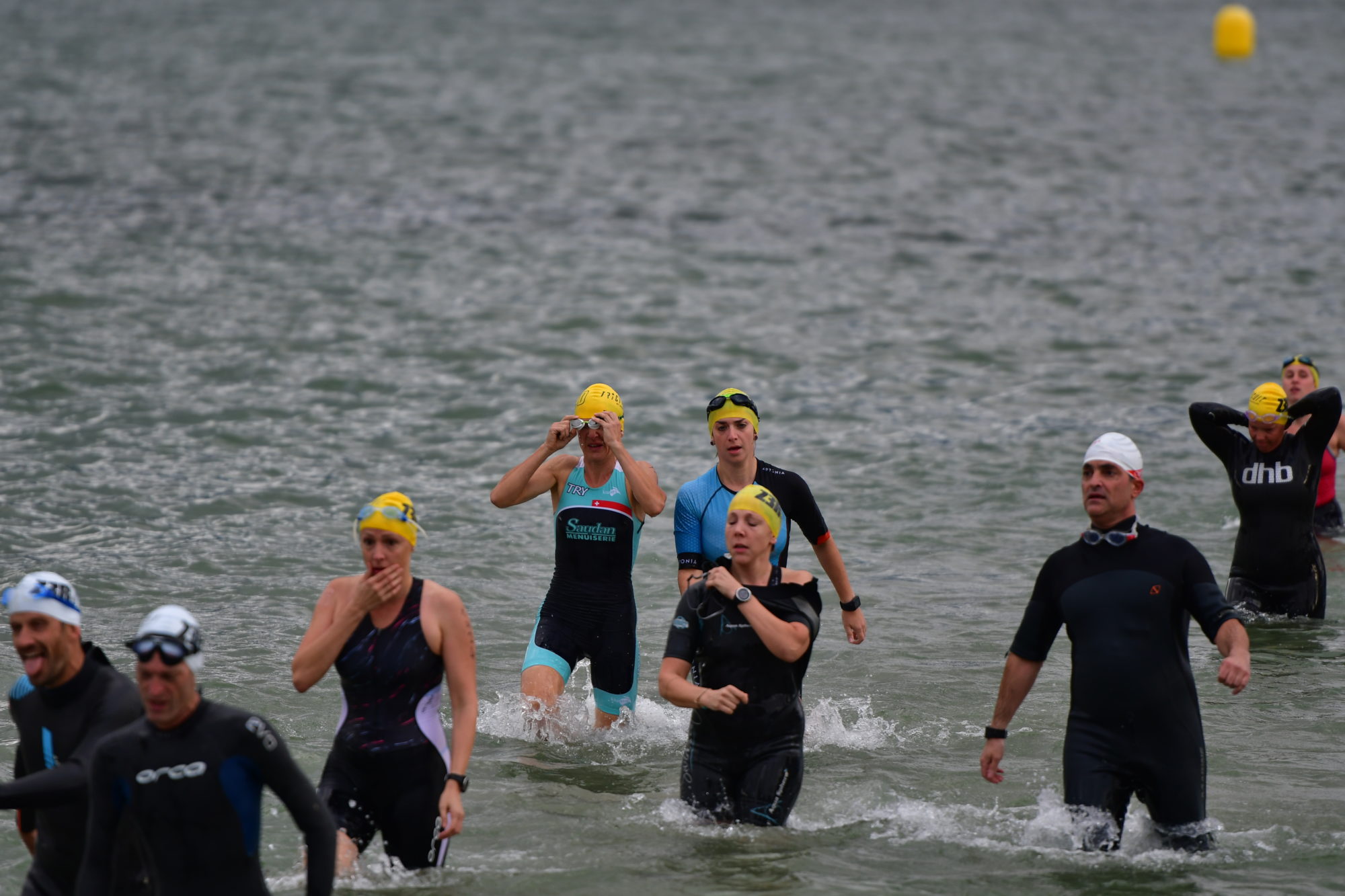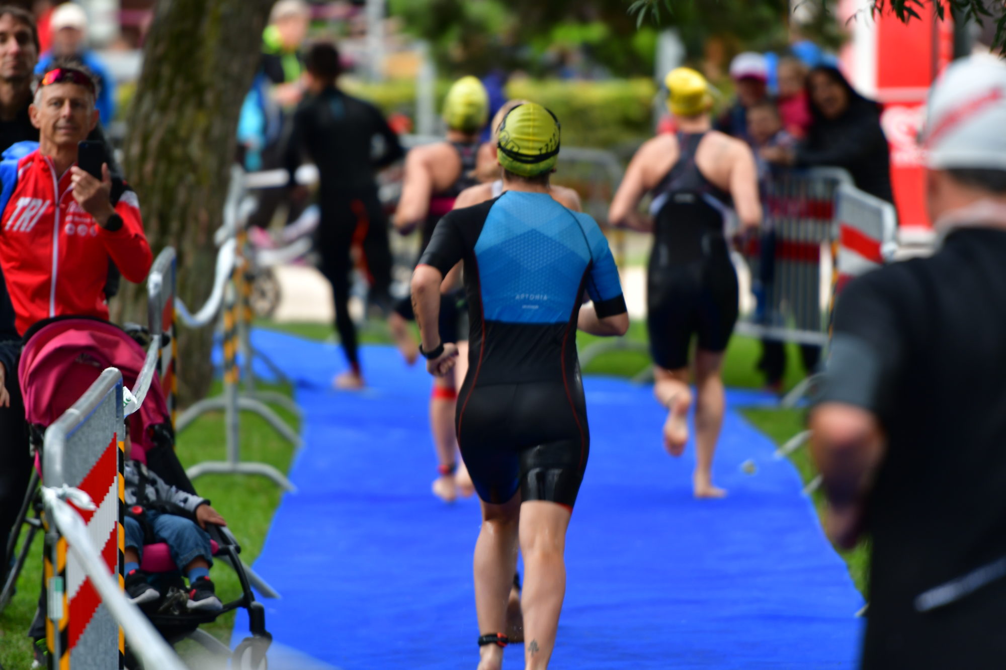 L’eau étonnamment n’est pas trop froide, je pars donc comme je peux, d’abord en brasse avec la tête hors de l’eau, puis en brasse sous l’eau, puis en crawl, puis j’alterne tout… c’est pas évident, mais je m’en sors pas trop mal. Je suis le mouvement et assez vite je vois la dernière ligne droite. Elle me paraît interminable, je fais donc plus de crawl aussi pour calmer ma respiration, mais je ne vois pas très bien. Mes lunettes prennent l’eau, je dois les vider toutes les 3-4 minutes, elles accrochent pas bien, ça m’énerve ! Je refais de la brasse, puis j’attends de toucher le fond pour terminer en marchant jusqu’à la plage. Et là il y a le tapis bleu qui nous mène à la zone de change/transition.