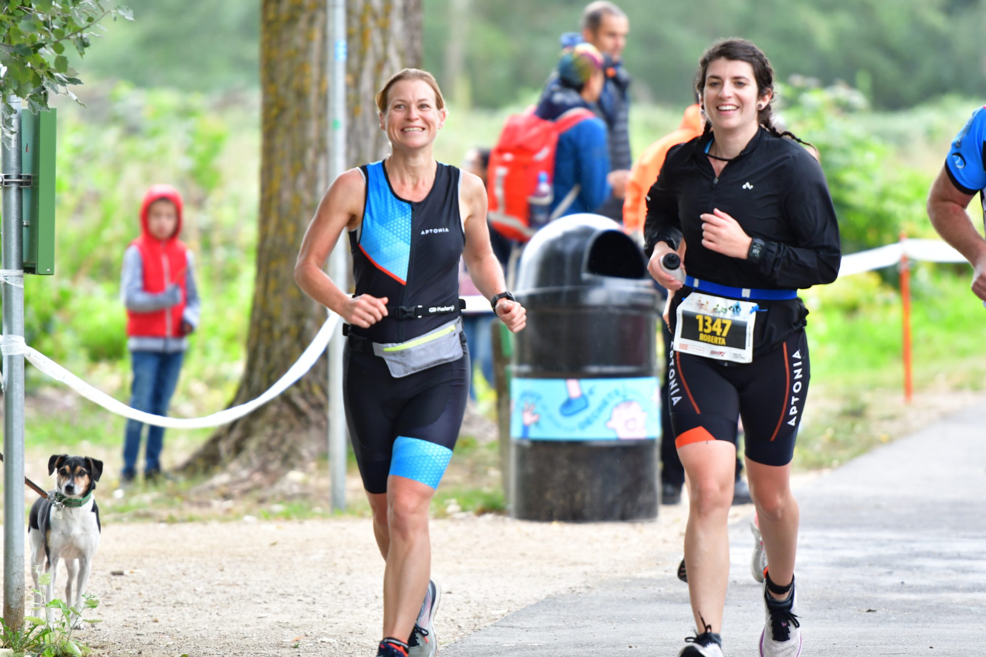 Elle est derrière moi, je l’attends, elle me rattrape, je suis tellement contente de courir avec elle ! 😀 Je lui dis tout de suite « moi je peux pas courir plus vite, si tu veux y aller vas-y seulement ! », mais je suis soulagée qu’elle décide de rester courir avec moi ! 😀 D’ailleurs moi je n’arrive toujours pas à reprendre mon souffle normal, mais je fais avec. Je pense avoir dit au moins 15 fois que c’est la première et dernière fois que je fais ce fichu triathlon !!