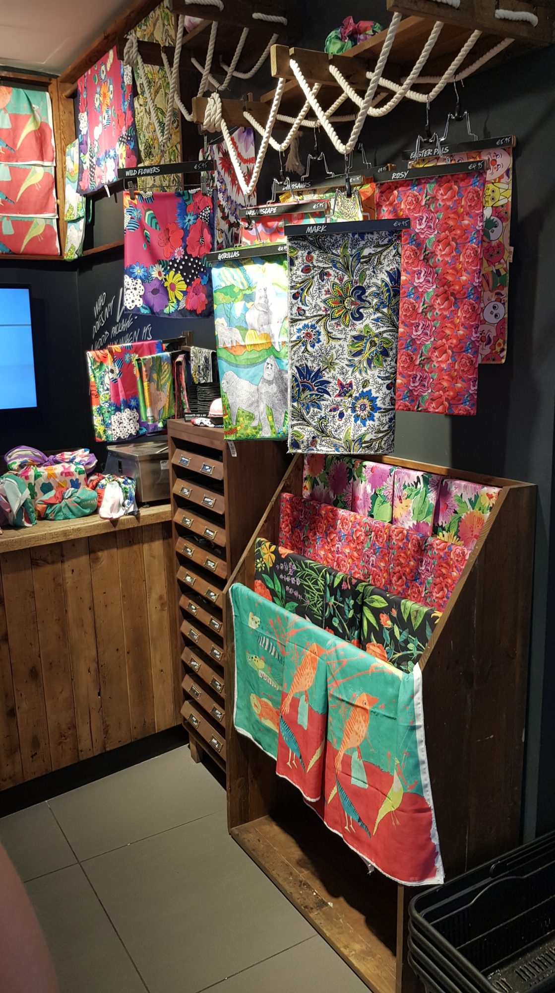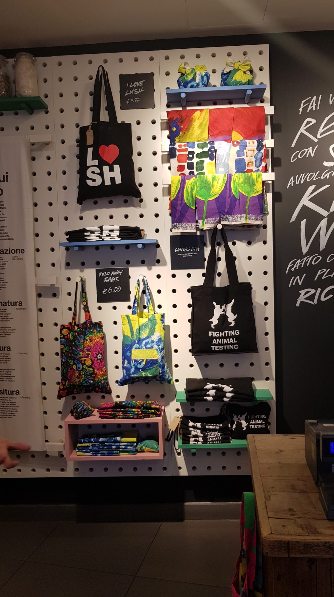 C’était vraiment une super journée, j’ai pu découvrir des nouveaux produits, mais aussi des produits qui ne sont disponibles à la vente qu’à Milan, pour l’occasion du Naked Shop. Nous avons également eu un petit atelier d’emballage de produits avec des superbes tissus, c’était vraiment chouette et intéressant ! Et toutes les décorations que vous voyez sur les vitres, elles ont été peintes à la main ! 🙂 Sans parler des meubles, qui eux aussi sont recyclés de bois d’anciennes fermes anglaises.