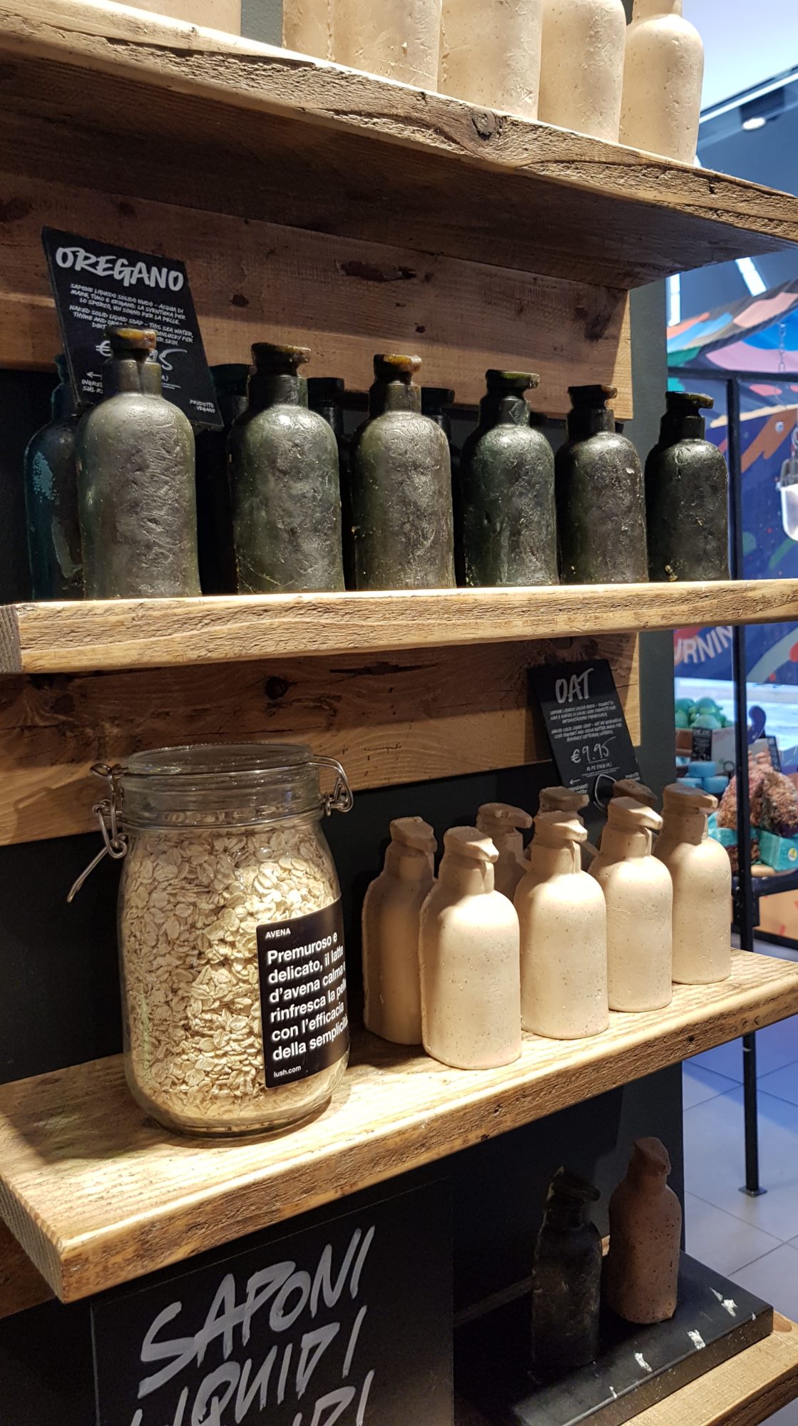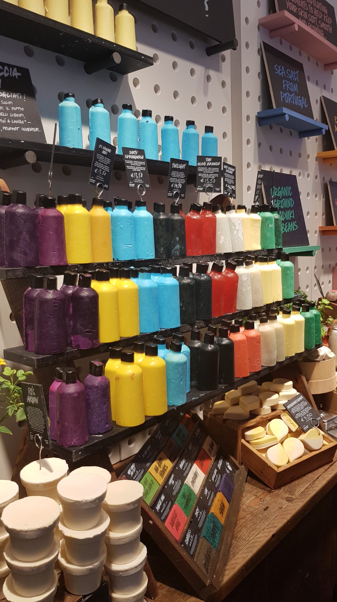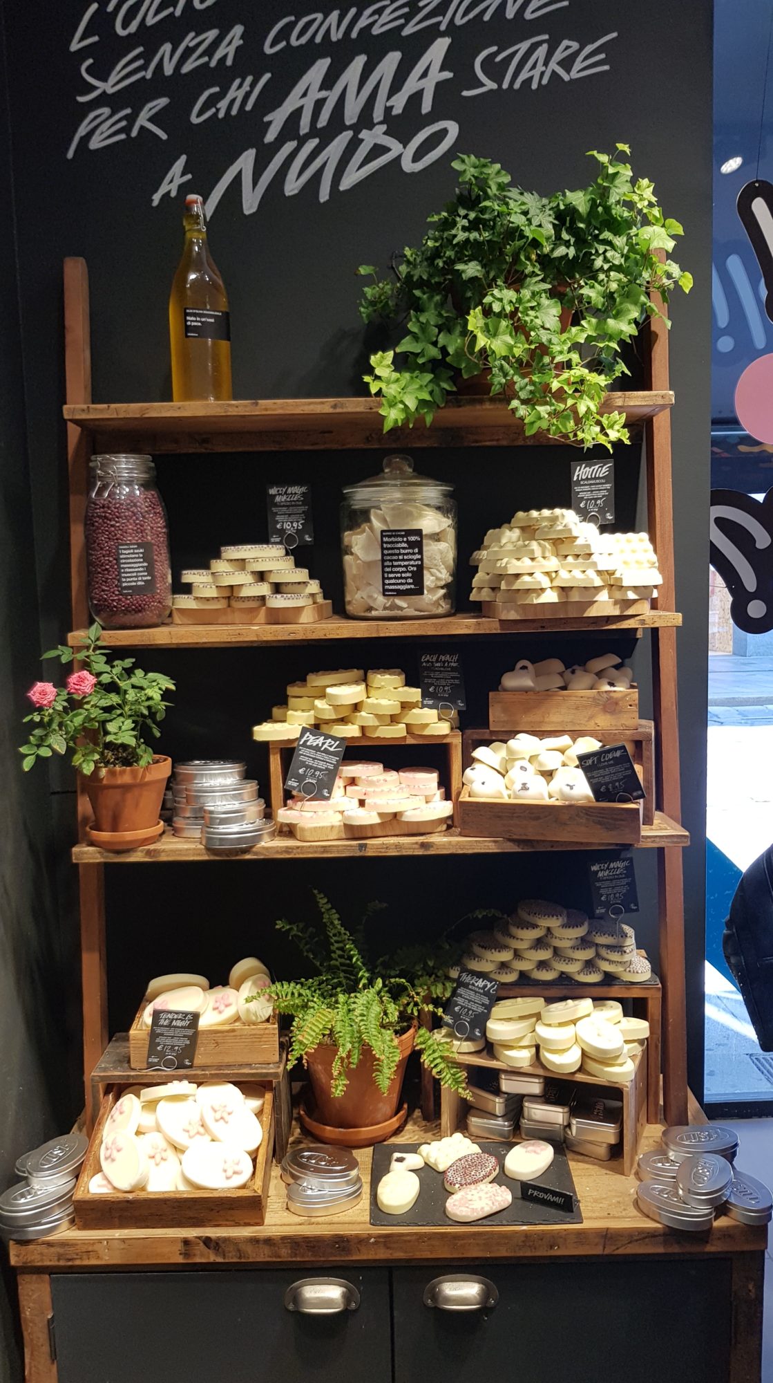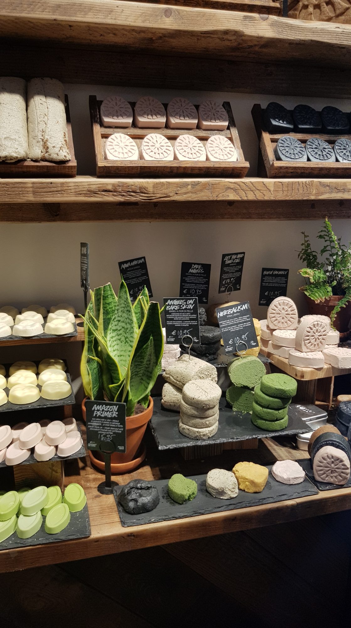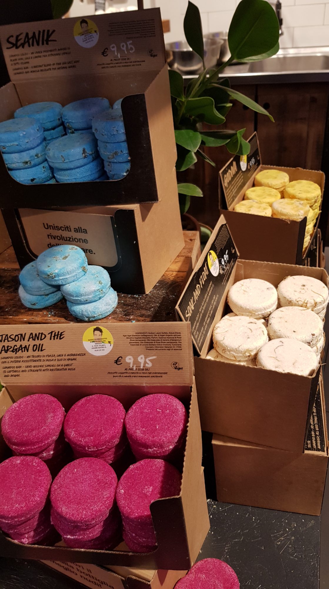 En fait le Naked Shop innove car tous une grande partie des produits que l’on trouve dans les Lush habituels, ici ils sont sans emballage. Par exemple l’exfoliant Let The Good Times Roll, habituellement en pot, se vend à Milan sans pot 🙂 Je pense que c’est pratique lorsque tu as terminé un produit et que tu souhaite le remplir à nouveau !